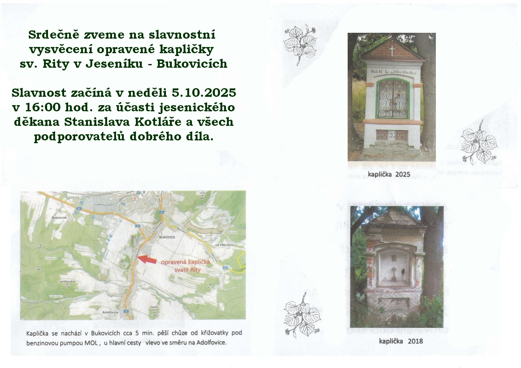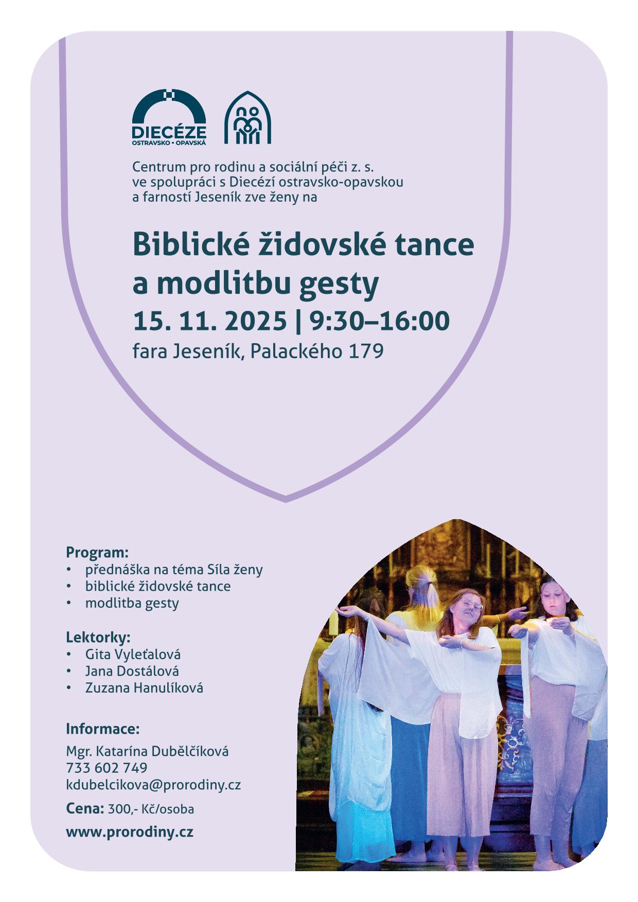 Pobočka Centra pro rodinu a sociální péči v Krnově ve spolupráci s Biskupstvím ostravsko-opavským a římskokatolickou farností Jeseník zve všechny ženy na setkání s tématem Biblické židovské tance. Setkání se uskuteční v sobotu 15. listopadu 2025 od 9.30 hodin na faře v Jeseníku (Palackého 179). Připravena bude přednáška na téma Síla ženy, biblické židovské tance a modlitba gesty.